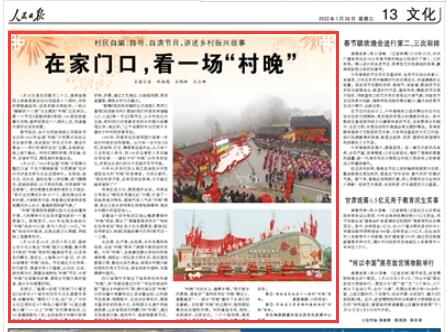 1月25日至26日,農(nóng)歷小年之際,國(guó)家公共文化云推出“村晚”接力云展播,集中展示《我的“村晚”我的年》融媒體節(jié)目,以及來自內(nèi)蒙古、黑龍江、上海等20個(gè)?。▍^(qū)、市)的30場(chǎng)精彩“村晚”活動(dòng)。節(jié)目通過文化傳承、時(shí)代新風(fēng)、展望未來3個(gè)篇章,以訪談、互動(dòng)、游戲等方式,展播各地特色“村晚”節(jié)目、分享“村晚”臺(tái)前幕后故事、展現(xiàn)鄉(xiāng)村振興美好畫卷、推介鄉(xiāng)村美景好物。