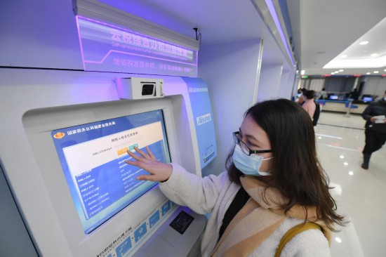 2021年1月15日,在國(guó)家稅務(wù)總局福州市臺(tái)江區(qū)稅務(wù)局辦稅服務(wù)廳,一名企業(yè)員工通過自助終端查詢納稅信用等信息。新華社記者 宋為偉 攝