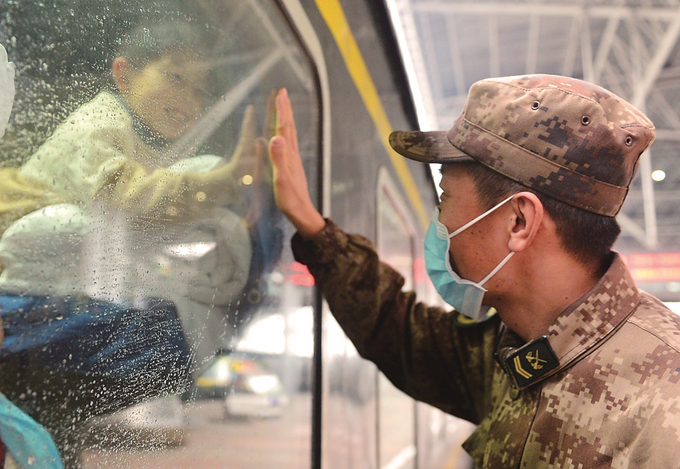 26日,隨著虎年春節(jié)臨近,南京火車站迎來春運客流高峰。返鄉(xiāng)旅客懷著對“家”滿滿的愛踏上旅程。圖為一位解放軍戰(zhàn)士與返鄉(xiāng)的兒子隔著車窗玻璃把手掌疊在一起。本報記者 郎從柳 攝