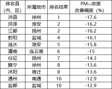 PM2.5濃度改善幅度相對較好的前10位(1-10名)依次是:沛縣、洪澤(江都并列)、射陽、漣水、灌南、儀征、睢寧(沭陽并列)、通州(鹽都并列)。