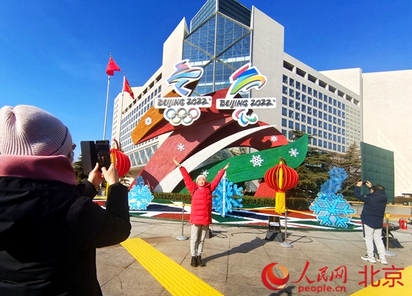 西單西北角“開放冬奧”花壇。人民網(wǎng) 池夢蕊攝