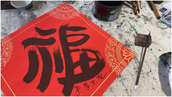 朱者赤是去年7月入駐藝術(shù)村的自由職業(yè)藝術(shù)家,今年,他決定留在林家村過年,他希望以送“?!钡姆绞絹肀磉_(dá)自己真摯的祝福,與村民們一起歡度春節(jié)。581幅各不相同的藝術(shù)“福”字,正是他送給村中581戶家庭的新年禮物。“入駐半年來,政府部門的關(guān)心幫助和支持與村民們熱情地問候讓我非常感動,我懷著感恩的心情,寫下這581個創(chuàng)意福字?!敝煺叱嗾f。