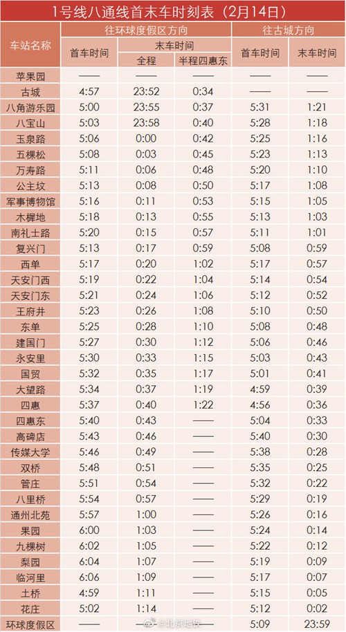 2月14日晚北京地鐵1號(hào)線八通線、2號(hào)線、7號(hào)線延長(zhǎng)運(yùn)營(yíng)時(shí)間