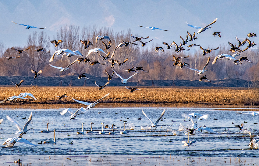 隨著天氣漸暖,棲息在山西省運(yùn)城市萬(wàn)榮縣黃河濕地越冬的白天鵝十分活躍,它們?cè)跐竦鼗蝻w翔、或覓食、或嬉戲,為一年一度的遷徙做準(zhǔn)備,吸引眾多游客前來(lái)觀賞。