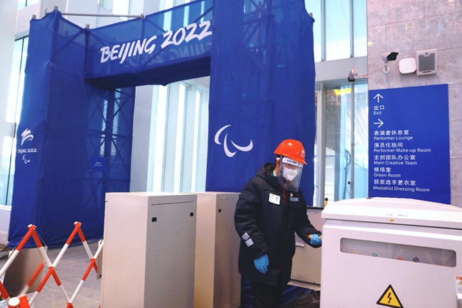 國網(wǎng)北京頒獎廣場電力保障團隊成員在延慶冬殘奧頒獎廣場巡視舞臺區(qū)設(shè)備,確保頒獎儀式供電可靠。張博寧攝