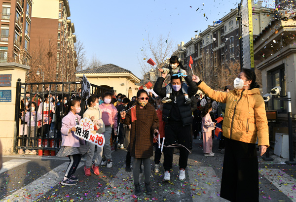 在潤澤悅溪小區(qū)門口,工作人員快速拆除快遞架,小區(qū)大門緩緩打開,居民們興高采烈地結(jié)伴走出小區(qū)。社區(qū)黨委書記、居委會主任分別向志愿者代表頒發(fā)證書并送上鮮花,向入駐社工、民警、機關(guān)工作人員獻上鮮花,為社區(qū)衛(wèi)生服務中心和來廣營派出所送錦旗,為愛心企業(yè)頒發(fā)獎牌。居民代表向社區(qū)黨委及小區(qū)物業(yè)送錦旗。3月8日也是國際婦女節(jié),地區(qū)特意制作了電子賀卡,為每位女性同胞送上節(jié)日祝福。