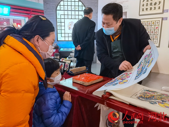 武強木版年畫省級非遺傳承人康英勤向小朋友介紹武強木版年畫。 河北省群眾藝術館(省非遺保護中心)供圖