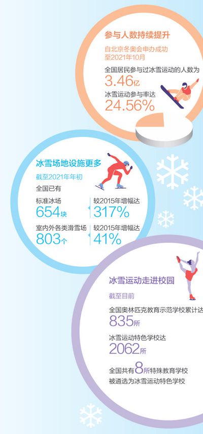 在江蘇,“我為冬奧喝彩”江蘇省全民冰雪運動大動員、冰雪嘉年華、冰壺挑戰(zhàn)賽等活動的舉辦,讓群眾享受冰雪運動帶來的快樂。在四川西嶺雪山滑雪場和成都融創(chuàng)雪世界室內滑雪場,大量體育愛好者感受到冰雪運動的魅力。大江南北,長城內外,一座座滑雪場規(guī)劃建設,一座座冰雪特色校興辦起來……北京冬奧會和冬殘奧會各個場館也正在積極籌備向公眾開放的計劃。北京冬奧組委規(guī)劃建設部部長劉玉民表示,北京冬奧會最重要的遺產成果是實現(xiàn)了“帶動3億人參與冰雪運動”的目標。