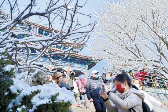 在其他市屬公園,昨天一早亦是同樣盛景——北海公園內,花雪簇簇映白塔;香山公園內,蠟梅傲雪更沁香;景山公園內,飛雪春花映紅墻……春花與雪相遇在園林古建中,共同構建出詩情畫意的三月北京獨特春景。