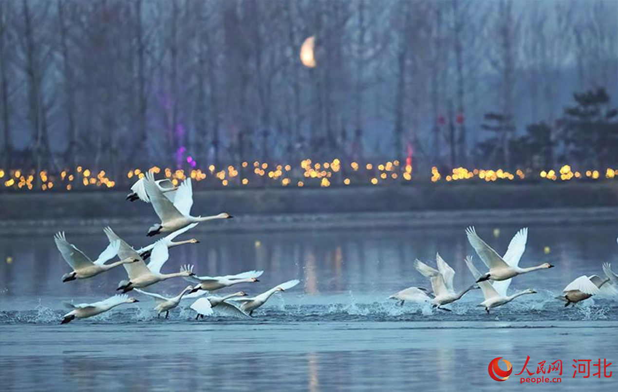 河北省石家莊市滹沱河葉子廣場東側(cè)的水面上,數(shù)百只白色的精靈小天鵝在這里嬉戲。 劉洵攝