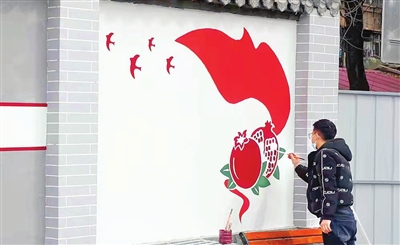 圖為專業(yè)人員對墻體進行主題彩繪。朱明鑰 李朋林 攝影報道
