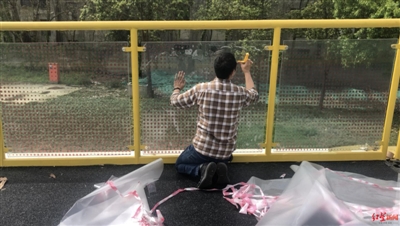 該座天橋大約有三分之一的玻璃護(hù)欄已經(jīng)貼上了膜。未貼膜的玻璃護(hù)欄有的橫著拉了兩條“警戒線”,有的拉了三條。“要不了多久就能貼完了”,現(xiàn)場工作人員表示,“警戒線”是臨時措施,貼完膜就會取掉。
