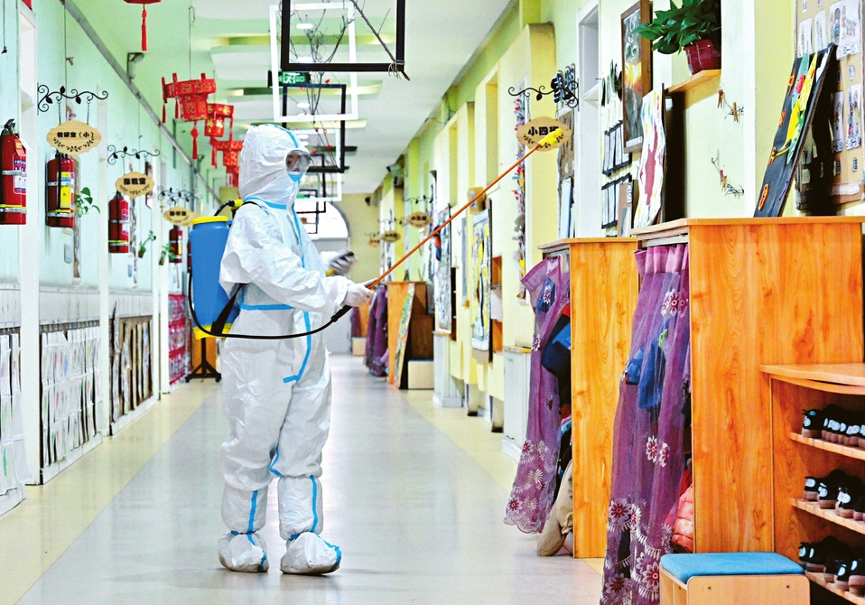 離石區(qū)實(shí)驗(yàn)幼兒園工作人員對(duì)園區(qū)進(jìn)行消殺