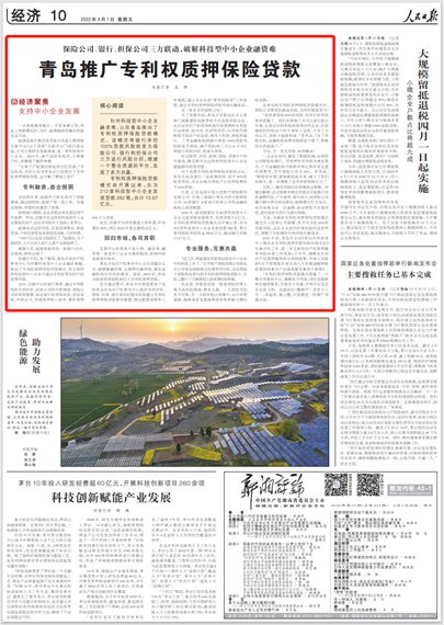 人民日?qǐng)?bào)點(diǎn)贊青島:推廣專(zhuān)利權(quán)質(zhì)押保險(xiǎn)貸款 破解科技型中小企業(yè)融資難