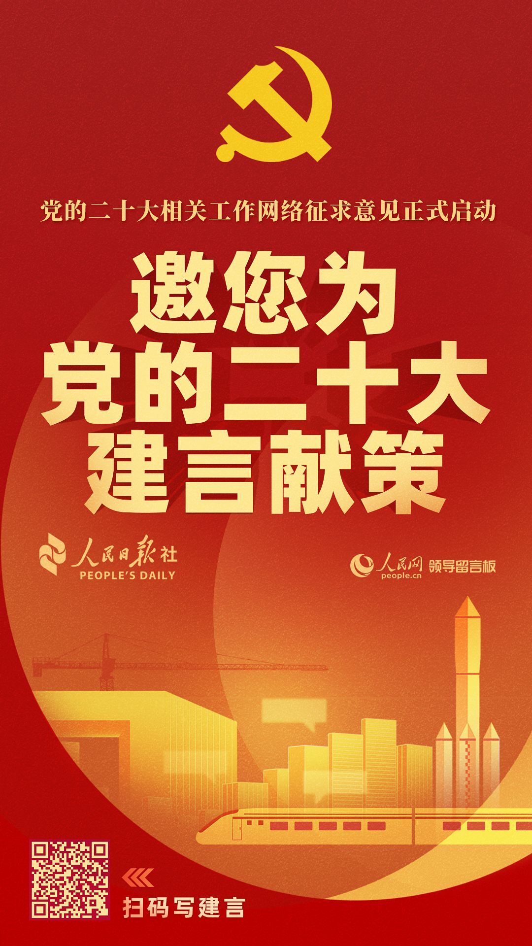 黨的十九屆六中全會(huì)決定,黨的二十大于2022年下半年在北京召開(kāi)。開(kāi)展黨的二十大相關(guān)工作網(wǎng)絡(luò)征求意見(jiàn),充分彰顯了以習(xí)近平同志為核心的黨中央發(fā)揚(yáng)民主、集思廣益的優(yōu)良作風(fēng),是我們黨堅(jiān)持以人民為中心、尊重人民主體地位、走好群眾路線(xiàn)的重要體現(xiàn),是發(fā)揮中國(guó)特色社會(huì)主義制度優(yōu)勢(shì)、推進(jìn)全過(guò)程人民民主的生動(dòng)實(shí)踐,是適應(yīng)互聯(lián)網(wǎng)時(shí)代新要求、推進(jìn)國(guó)家治理體系和治理能力現(xiàn)代化的有益探索。