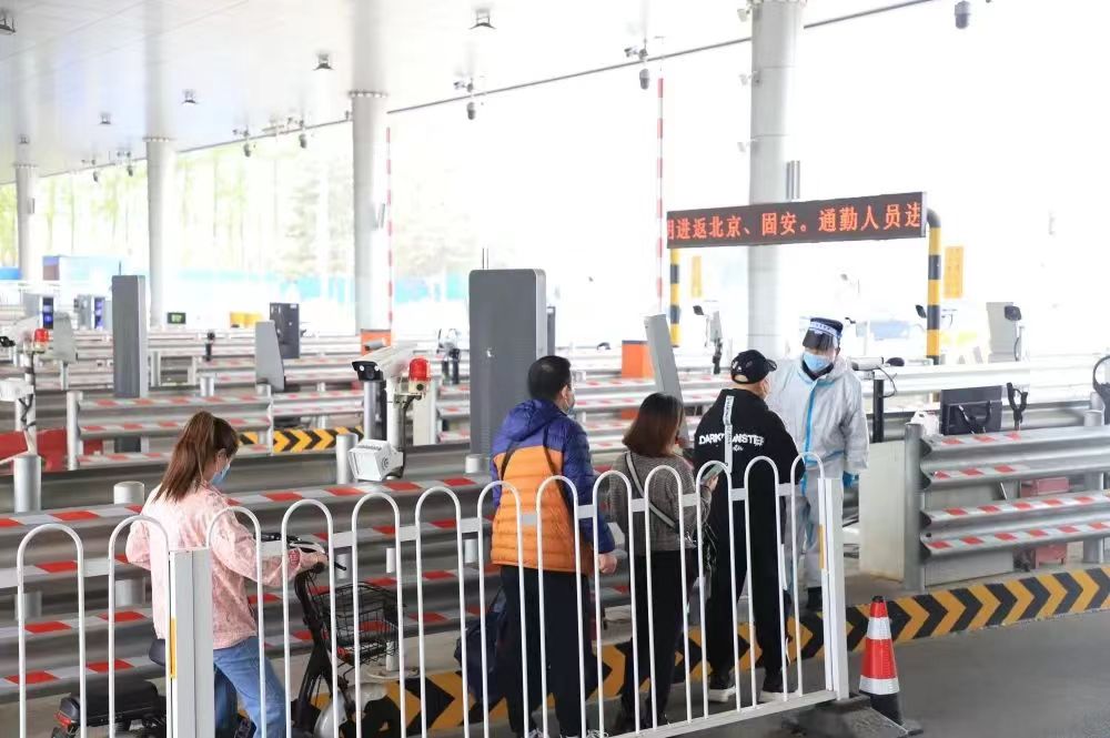 “根據(jù)疫情防控工作,4月11日零時(shí)起,固安縣通勤人員恢復(fù)進(jìn)返北京、固安。目前,堅(jiān)持非通勤人員非必要不進(jìn)京,如因重大疾病等極特殊原因確需進(jìn)京的人員,需出示相應(yīng)證明后進(jìn)京,并嚴(yán)格執(zhí)行北京市疫情防控政策?!惫贪部h辛立村公安檢查站站長(zhǎng)徐立說。