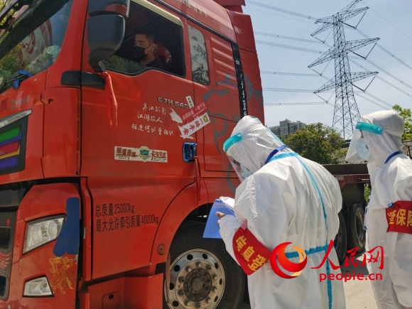 工作人員對(duì)外來貨車及駕乘人員進(jìn)行信息登記。人民網(wǎng)記者 王繼亮攝