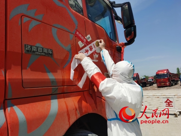 疫情防控人員對(duì)外來貨車進(jìn)行消殺。人民網(wǎng)記者 王繼亮攝