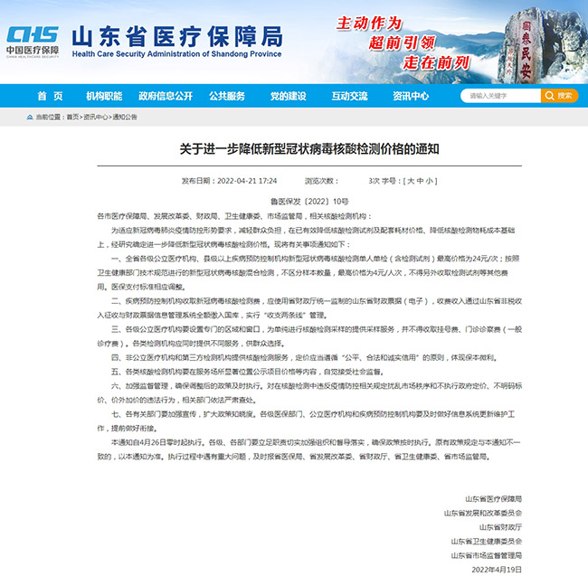 為適應(yīng)新冠病毒肺炎疫情防控形勢要求,減輕群眾負擔,在已有效降低核酸檢測試劑及配套耗材價格、降低核酸檢測物耗成本基礎(chǔ)上,進一步降低新型冠狀病毒核酸檢測價格。山東省各級公立醫(yī)療機構(gòu)、縣級以上疾病預(yù)防控制機構(gòu)新型冠狀病毒核酸檢測單人單檢(含檢測試劑)最高價格為24元/次;按照衛(wèi)生健康部門技術(shù)規(guī)范進行的新型冠狀病毒核酸混合檢測,不區(qū)分樣本數(shù)量,最高價格為4元/人次,不得另外收取檢測試劑等其他費用。