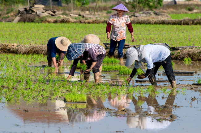 4月24日,金華市婺城區(qū)蔣堂鎮(zhèn)洪村田間地頭,農(nóng)民在搶農(nóng)時忙插早稻秧苗。谷雨節(jié)氣剛過,正是水稻栽種的好時機(jī),但受疫情影響,大型農(nóng)機(jī)和操作人員難以進(jìn)入,機(jī)械化種糧進(jìn)程受阻。為不耽擱農(nóng)時,當(dāng)?shù)胤N糧大戶組織人力進(jìn)行早稻插秧。(胡肖飛)