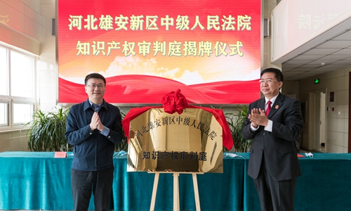 河北雄安新區(qū)中級人民法院知識產權審判庭揭牌儀式現(xiàn)場。 雄安中院供圖