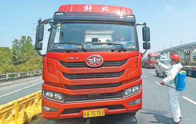 4月21日,郭輝駕駛貨車返回南京后,防疫工作人員對貨車進(jìn)行消毒。本報(bào)記者 姚雪青攝