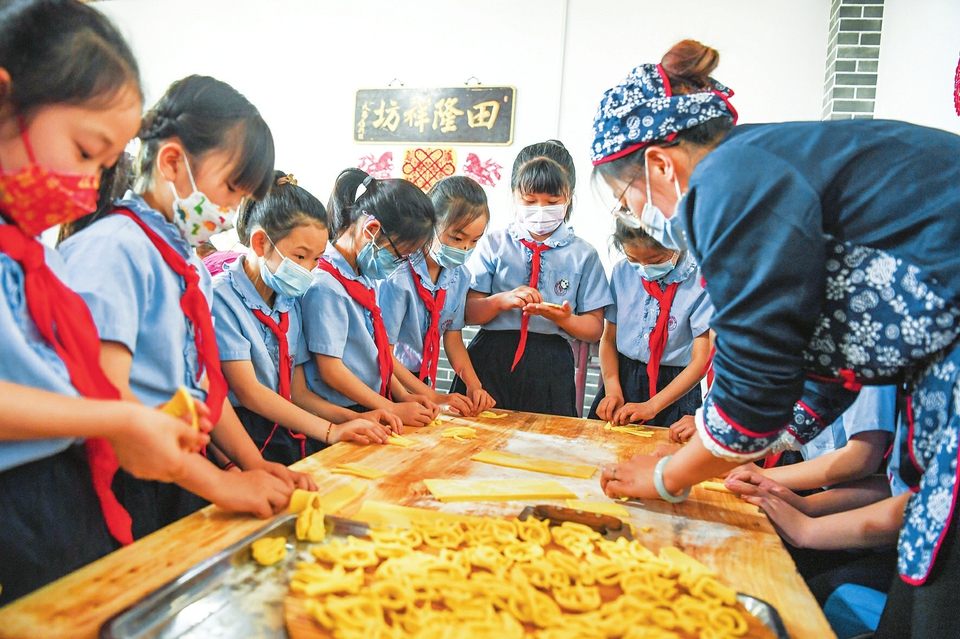 5月3日,平遙縣實(shí)驗(yàn)小學(xué)三年級(jí)463班的學(xué)生在平遙縣田隆祥油花花非遺傳學(xué)基地體驗(yàn)油花花、月餅等傳統(tǒng)食品的制作過(guò)程。“五一”期間,平遙縣實(shí)驗(yàn)小學(xué)在做好疫情防控的同時(shí),組織學(xué)生就地開展多種形式的非遺文化項(xiàng)目傳學(xué)活動(dòng),讓孩子們近距離感受非遺文化的魅力,豐富假期生活。(梁生仁攝)