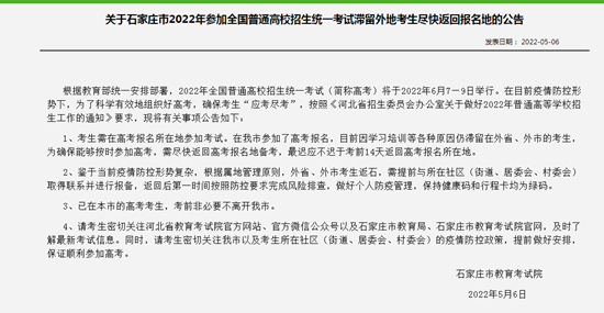 關(guān)于石家莊市2022年參加全國(guó)普通高校招生統(tǒng)一考試滯留外地考生盡快返回報(bào)名地的公告