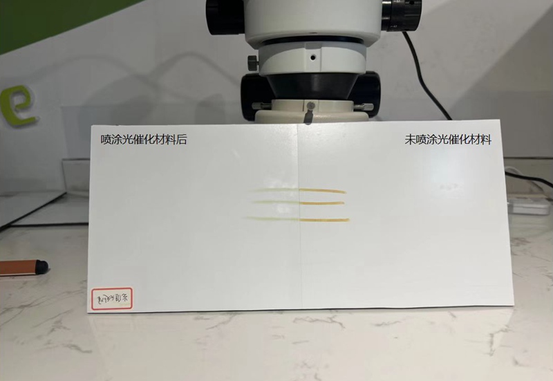 “將一塊鋁面板一分為二,一塊噴涂光催化涂膜,另一塊不噴涂。用有機染料筆模仿外界污染物,在兩塊材料表面標記后,通過一分鐘紫外光燈照射,可看出噴涂了光催化涂膜的瓷磚鋁板部分染料降解效果明顯更高?!惫ぷ魅藛T告訴人民網(wǎng)浙江頻道,根據(jù)國家權(quán)威檢測機構(gòu)的實驗證明,每噴涂1立方米的光催化涂膜,就能清除95%的甲醛。