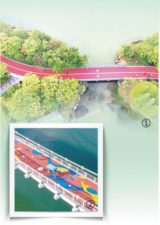 圖①:江西省贛州市章貢區(qū)一處濕地公園內的健身步道。