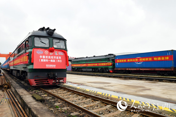 2月19日,2022年江西省首列中俄雙向?qū)﹂_班列(南昌—莫斯科)在南昌向塘國際陸港成功到發(fā)。“對開班列”的開行將大大提高集裝箱周轉(zhuǎn)效率,降低企業(yè)運輸成本。 人民網(wǎng) 時雨攝