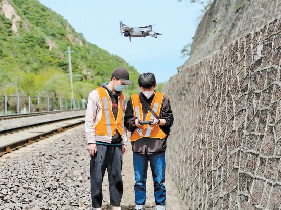 北京工務(wù)段職工利用無人機(jī)對高大山體等防洪處所進(jìn)行隱患排查。