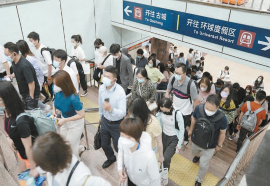 昨天早上八點半左右,地鐵國貿站呈現(xiàn)早高峰趨勢。 本報記者 劉平攝