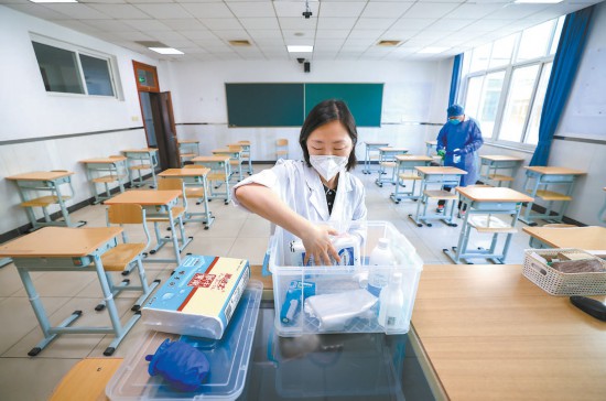 北京東直門中學(xué)考點(diǎn),老師正在展示考場配備的防疫物品箱,箱內(nèi)配備口罩、消毒酒精等防疫物品。 本報(bào)記者 潘之望攝