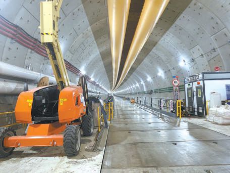 走進(jìn)項(xiàng)目工地,沒有想象中的機(jī)械轟鳴聲,施工現(xiàn)場位于幾十米深的地下。記者從地面乘坐直梯,順著盾構(gòu)機(jī)始發(fā)井,來到地下26米處的西線隧道內(nèi)。國產(chǎn)最大直徑泥水平衡盾構(gòu)機(jī)“京華號”,已在西線隧道里向前掘進(jìn)了近4000米。眼前的西線隧道,蜿蜒著向南延伸。開工初期,記者從始發(fā)井步行幾分鐘即可抵達(dá)盾構(gòu)機(jī)駕駛艙位置;這次采訪,施工方特意安排了1輛純電動代步車?!艾F(xiàn)在盾構(gòu)機(jī)離始發(fā)井有些遠(yuǎn),工作人員上下班都得坐車?!瘪{駛員說,這輛電動代步車是用吊車吊到隧道內(nèi)的,還特意為它在隧道里安了充電樁,“這輛車再回到地面,就得是隧道貫通的時(shí)候啦!”