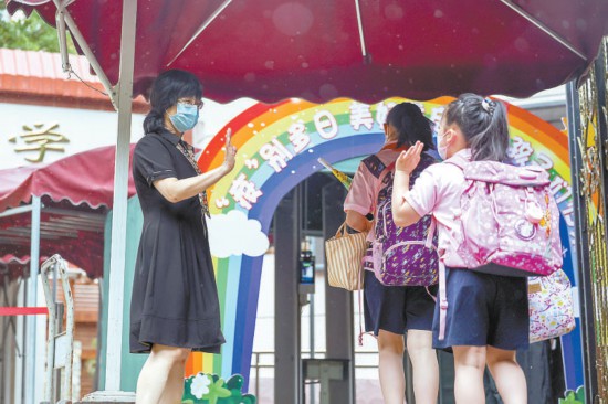 昨天早晨,豐臺(tái)區(qū)芳古園小學(xué),因疫情闊別校園多日的小學(xué)生返校復(fù)課,老師在校門(mén)口歡迎孩子們歸來(lái)。本報(bào)記者 鄧偉攝