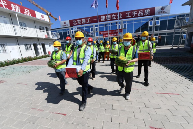 北京市已進(jìn)入盛夏高溫時節(jié),防暑降溫工作直接關(guān)系到勞動者身體健康和企業(yè)生產(chǎn)安全。7月7日,由北京市總工會主辦的“最美勞動者 微笑帶回家”系列活動暨清涼送給首都建設(shè)者活動,在北京建工路橋集團(tuán)通州數(shù)據(jù)中心項目舉行,北京建工路橋集團(tuán)黨委書記王曉輝代表公司黨委、工會對建設(shè)者進(jìn)行慰問,向奮戰(zhàn)在施工一線建設(shè)者們送去清涼及防疫物資和真摯問候。