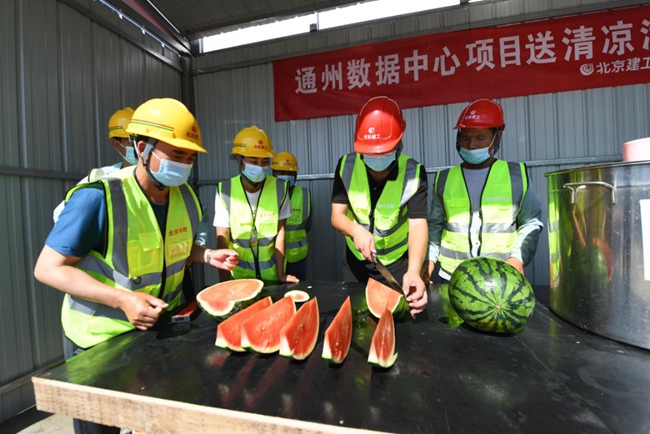 在通州數(shù)據(jù)中心項目頂板鋪設(shè)施工現(xiàn)場,高溫對奮戰(zhàn)在施工一線的員工來說無疑是一場巨大的“烤驗”?!半m然現(xiàn)場的溫度達(dá)到了38℃,但是項目部合理調(diào)配時間,對現(xiàn)場的防暑降溫工作做了全面部署,施工現(xiàn)場配備了西瓜、綠豆湯、藿香正氣水和清涼油等防暑物資,在場邊設(shè)置了遮陽涼棚,并且讓施工人員避開上10點到下午3點的高溫期錯時上崗,保證現(xiàn)場安全生產(chǎn)的同時也盡量不耽誤項目進(jìn)度?!表椖坎控?fù)責(zé)人胡永忠說。