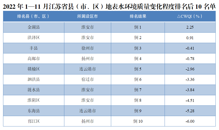 2022年1至11月江蘇地表水環(huán)境質(zhì)量排名公布 銅山漣水豐縣等排名倒數(shù)