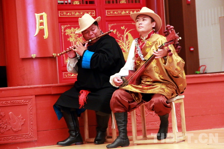 圖為拉薩市城關(guān)區(qū)娘熱民間藝術(shù)團(tuán)樂(lè)師米瑪(左)和拉巴次仁(右)為演出伴奏。米瑪是西藏自治區(qū)級(jí)嘎?tīng)杺鞒腥耍瑩?dān)任藝術(shù)團(tuán)笛子演奏、司鼓;拉巴次仁是拉薩市城關(guān)區(qū)級(jí)喇嘛瑪尼傳承人,擔(dān)任藝術(shù)團(tuán)扎木年演奏。攝影:劉莉