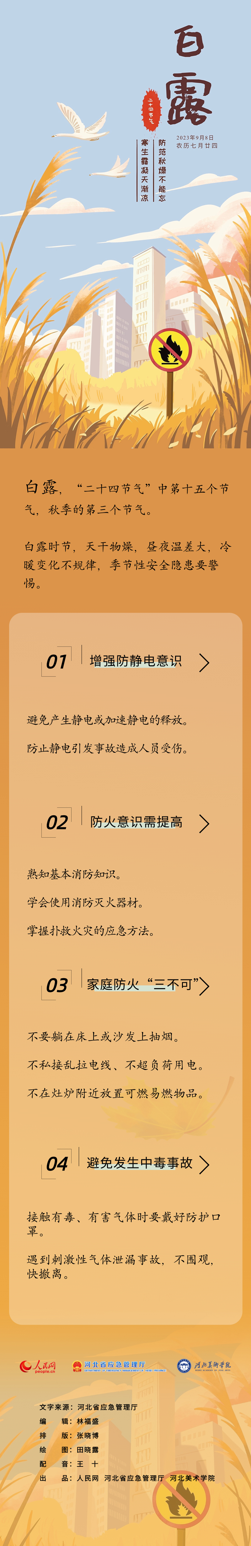 白露,“二十四節(jié)氣”中第十五個(gè)節(jié)氣,也是秋季的第三個(gè)節(jié)氣。白露時(shí)節(jié),天干物燥,晝夜溫差大,冷暖變化不規(guī)律,季節(jié)性安全隱患要警惕。近期,人民網(wǎng)與河北省應(yīng)急管理廳共同推出二十四節(jié)氣安全海報(bào)。今天,和小編一起來了解白露時(shí)節(jié),有哪些安全避險(xiǎn)小知識(shí)吧。