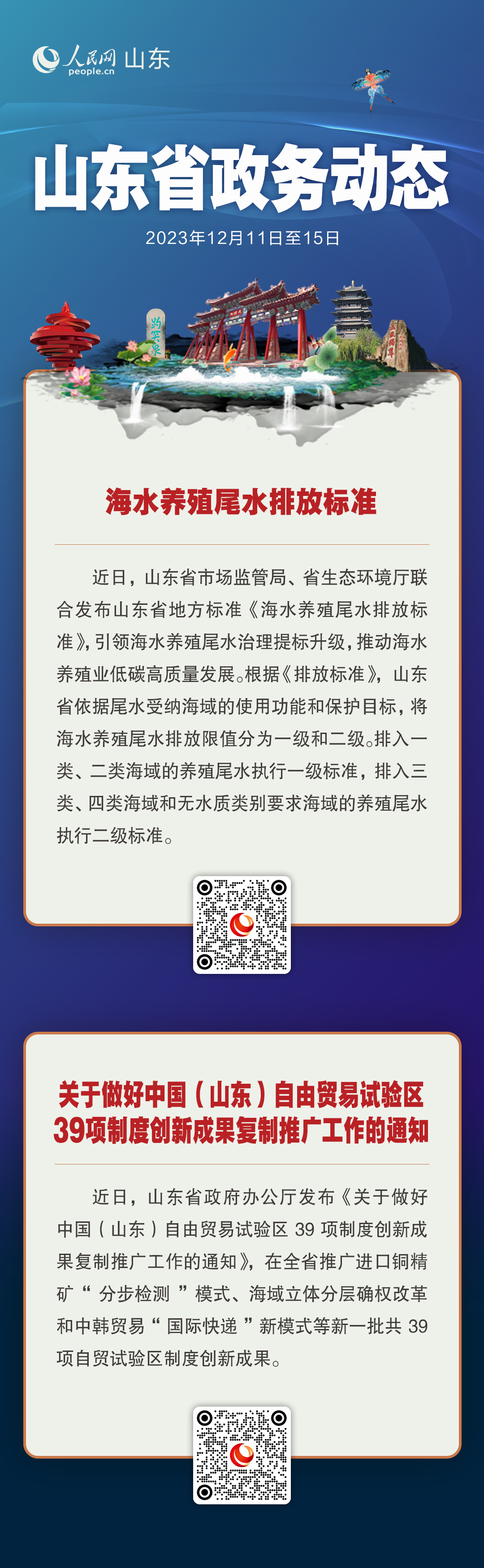 本周(12月11日至15日),山東省出臺(tái)了《海水養(yǎng)殖尾水排放標(biāo)準(zhǔn)》《關(guān)于做好中國(guó)(山東)自由貿(mào)易試驗(yàn)區(qū)39項(xiàng)制度創(chuàng)新成果復(fù)制推廣工作的通知》,具體如下: