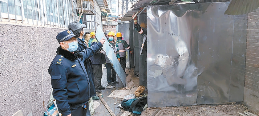 廣安門內(nèi)街道綜合執(zhí)法隊(duì)工作人員正在對(duì)私建鐵皮棚進(jìn)行拆除。