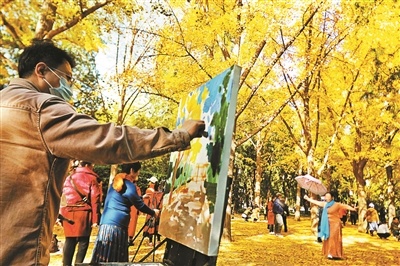 每年一進入11月,地壇公園內的200余株銀杏樹就被“染成”金黃色,形成“紅墻金葉”這一獨特景觀,成為京城秋日中一抹靚麗的風景。11月1日上午,地壇公園內“園林四季 秋之華彩”金秋銀杏活動吸引了不少青年藝術家、廣大藝術愛好者和游園群眾參與進來。陸愛民、李菲、賈見罡、李玉娥、王世高、徐佳、劉玉芬7位畫家相約而來,在地壇公園內用手中的畫筆定格美景、描繪金秋。