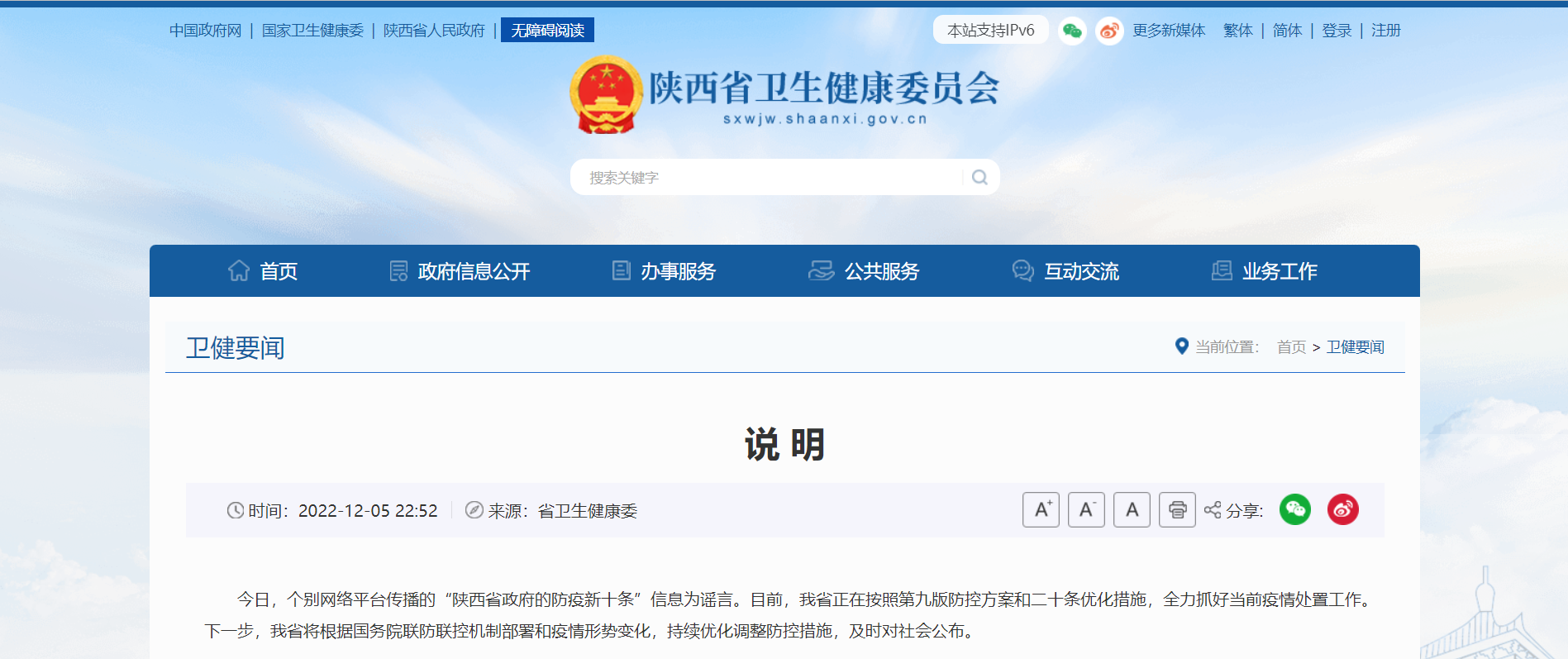 央廣網(wǎng)西安12月6日消息(見習(xí)記者侯凱奇)12月5日晚,陜西省衛(wèi)健委官網(wǎng)發(fā)布說明,明確提出個(gè)別網(wǎng)絡(luò)平臺(tái)傳播的“陜西省政府的防疫新十條”信息為謠言。