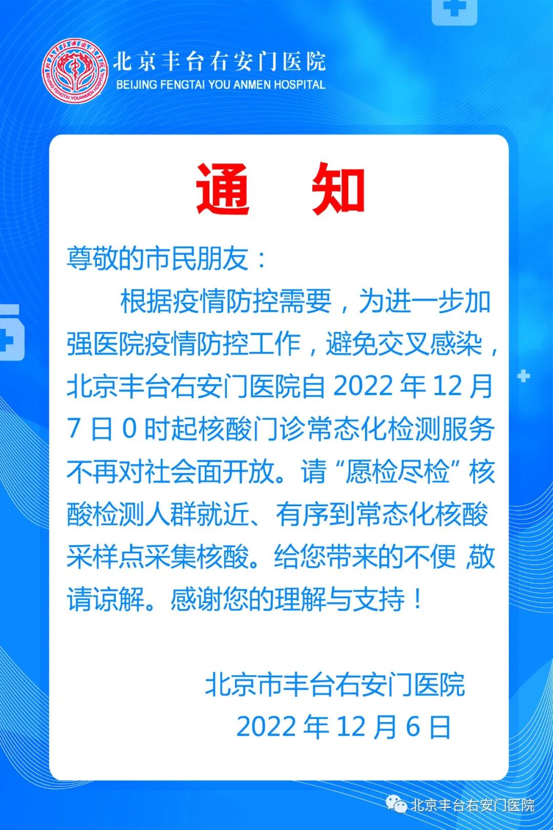 12月6日,北京豐臺(tái)右安門醫(yī)院發(fā)布核酸門診停診通知。其中提到,12月7日起核酸門診常態(tài)化檢測(cè)服務(wù)不再對(duì)社會(huì)面開放。