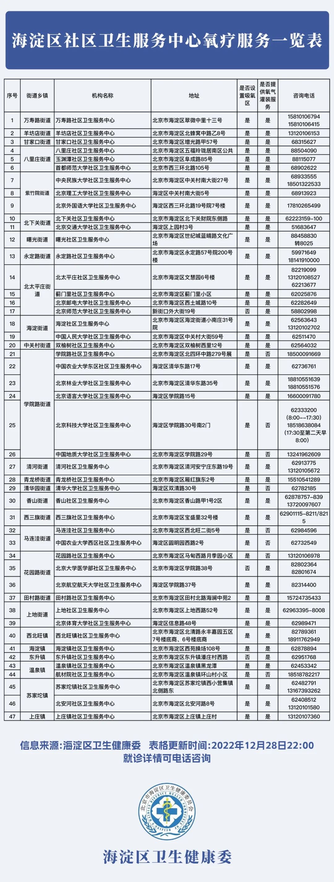 北京海淀區(qū)47家社區(qū)衛(wèi)生服務(wù)中心提供氧療服務(wù),一覽表請(qǐng)查收