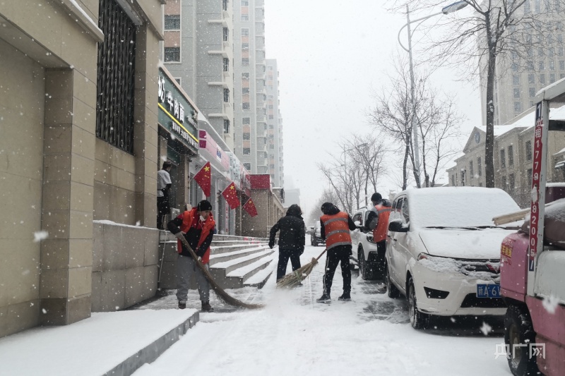 在新疆烏魯木齊市,工作人員正在清理道路積雪(央廣網(wǎng)記者羅成 攝)