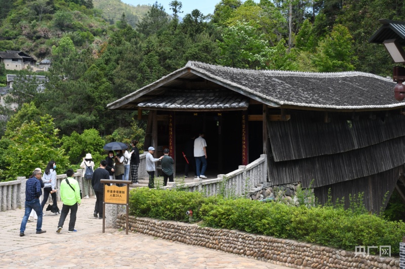游客參觀下黨鄉(xiāng)古廊橋“鸞峰橋”(央廣網(wǎng)記者 龔雯 攝)