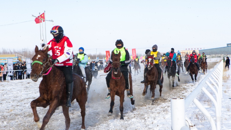 “馬匹就位,預(yù)備……”隨著裁判一聲令下,騎手們駕馭的賽馬如離弦之箭,爭先恐后奔騰而過,雪地上馬蹄聲聲、雪花飛揚(yáng)。參賽選手揮舞韁繩,策馬揚(yáng)鞭,像一陣疾風(fēng)掠過,盡情地在賽道上體驗著激情與速度。緊張刺激的比賽贏得觀眾的一片歡呼,大家紛紛拿出手機(jī)拍照,用鏡頭記錄下精彩的瞬間,現(xiàn)場歡呼聲、助威聲不絕于耳,把比賽氣氛推向了高潮。
